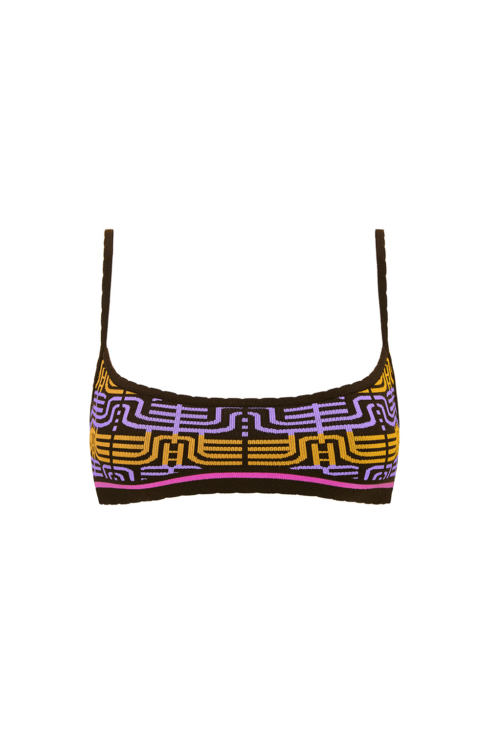 geometrical jacquard knitted bralette with slightly curved front and adjustable straps.