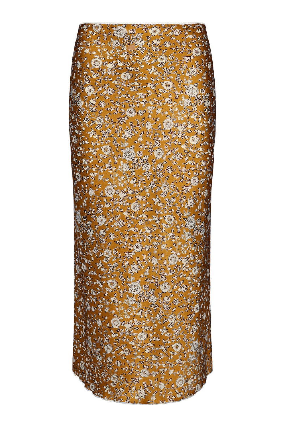 90's inspired knee-length skirt with elasticated waistband made in mini floral printed fabric. features a flattering bias cut silhouette and designed to worn at waist or hips.