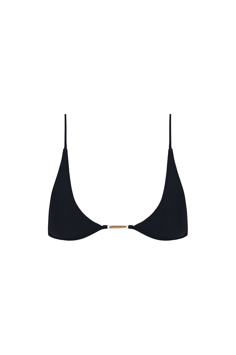 our bestselling universo bralette featuring gold toned herringbone chain detail at center front. this style has elongated fixed triangle cups with thin, adjustable straps and a V back. available in our sustainable compression fabric designed to smooth and support.