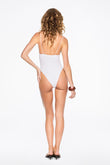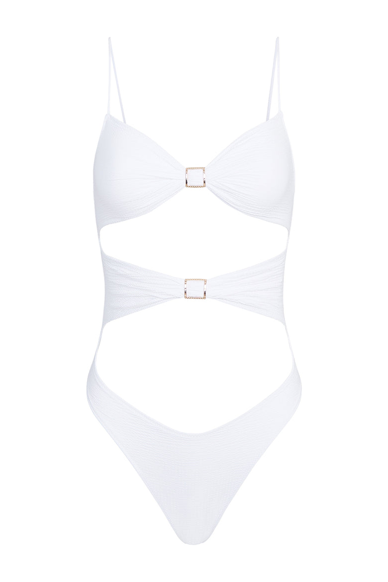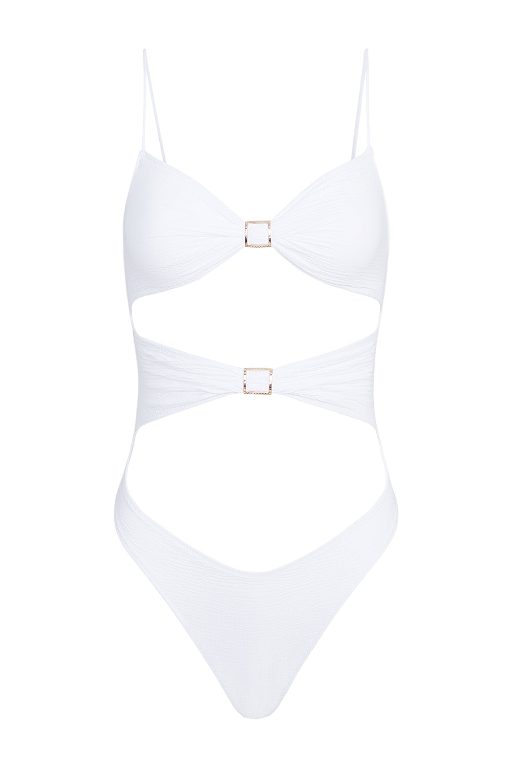 a one piece featuring twisted cut outs in the front with gold hardware details in our textured seersucker fabric. offers cheeky back coverage and high cut legs to elongate the body. designed with a low scoop neckline, skinny elastic cording straps, and purl edging. fully lined.
