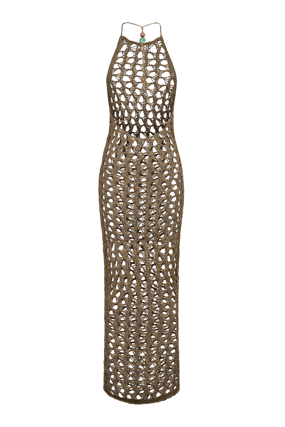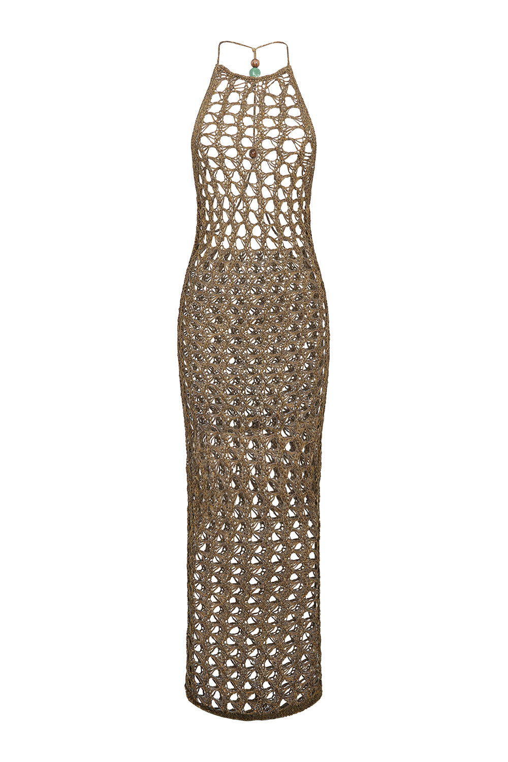 slim fitting knitted elaborate open stitch column dress with high neck and low cut back featuring a multicolor bead detail on the straps in printed organic mercerised cotton.