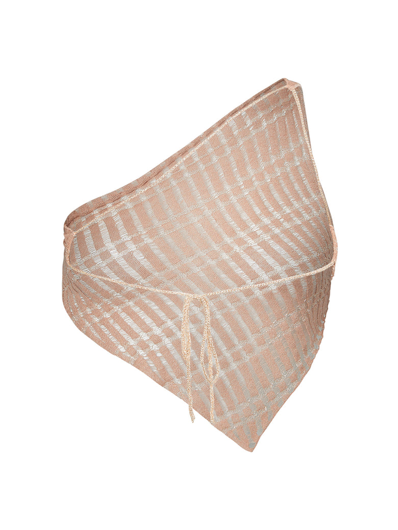 one-shoulder top with asymmetrical hem made in an open-stitch sheer hemp and gold lurex yarn. features adjustable ties at back.