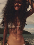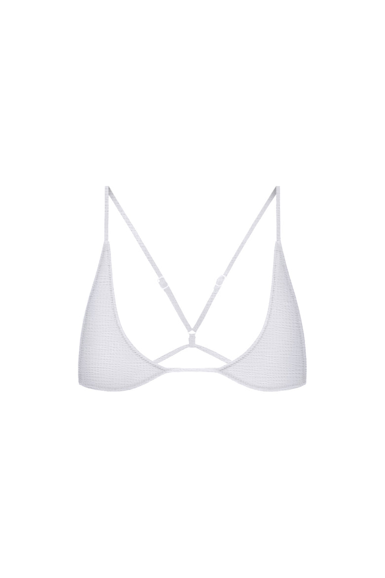 minimal coverage, elongated fixed triangle bralette top featuring thin, adjustable straps with a v back. made in our textured seersucker fabric.