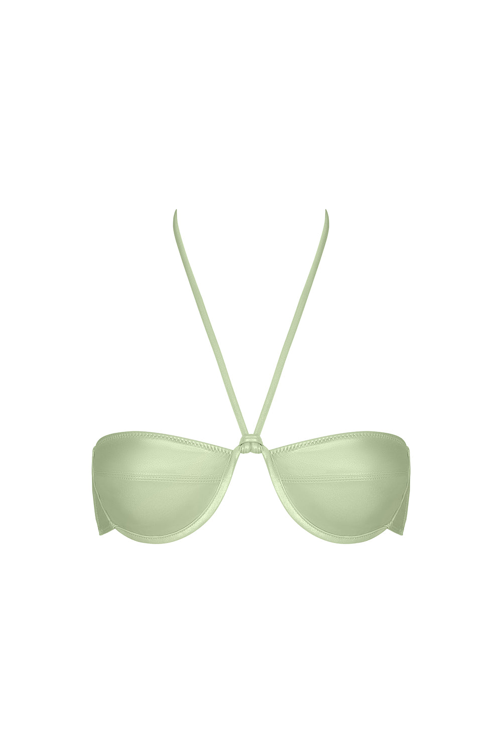 a strapless, demi-cup top with underwire and detachable strap for additional support. clasp closure at back.