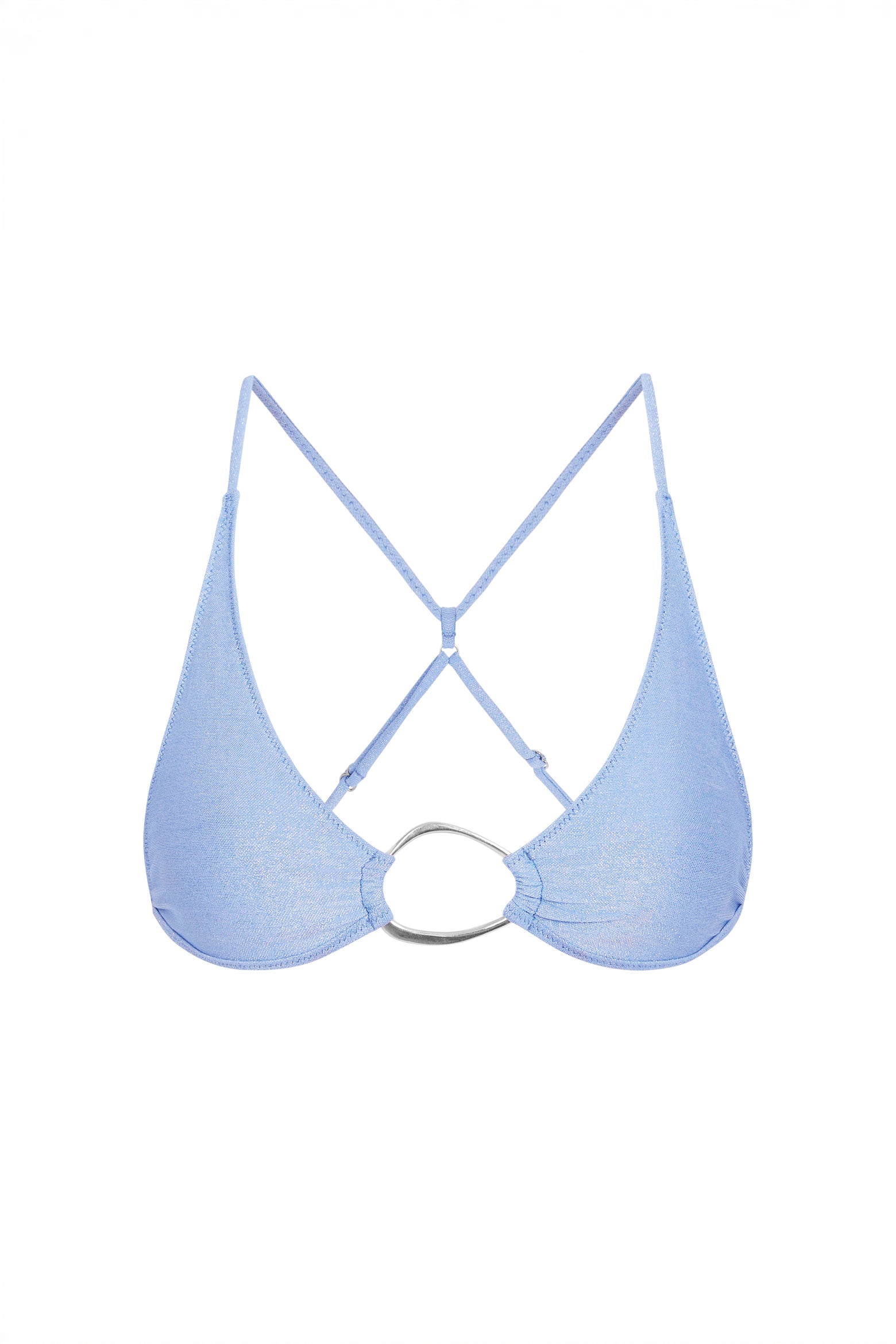 bestselling universo bralette featuring a refined silver metal ring with fluid oval shape at center front. this style has elongated fixed triangle cups with thin, adjustable straps and a V back.