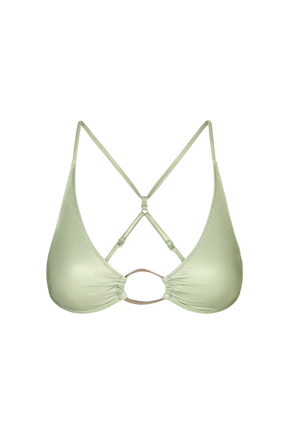 bestselling universo bralette featuring a refined silver metal ring with fluid oval shape at center front. this style has elongated fixed triangle cups with thin, adjustable straps and a V back.