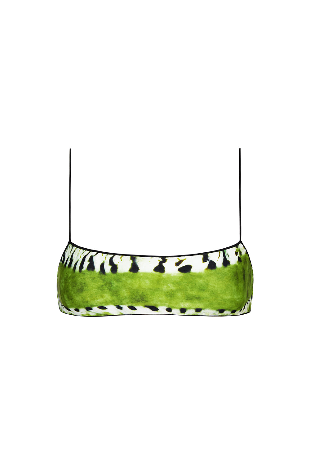 made in a digitally printed fabric featuring the kiwi shell pattern inspired by nature, blending a beach-born motif with the bright, juicy tones of ripe kiwi.